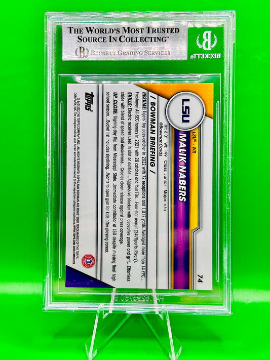 PSA GRADED SLAB - GEM MINT 9 - MALIK NABERS - 2024 BOWMAN CHROME UNIVERSITY SAPPHIRE FOOTBALL